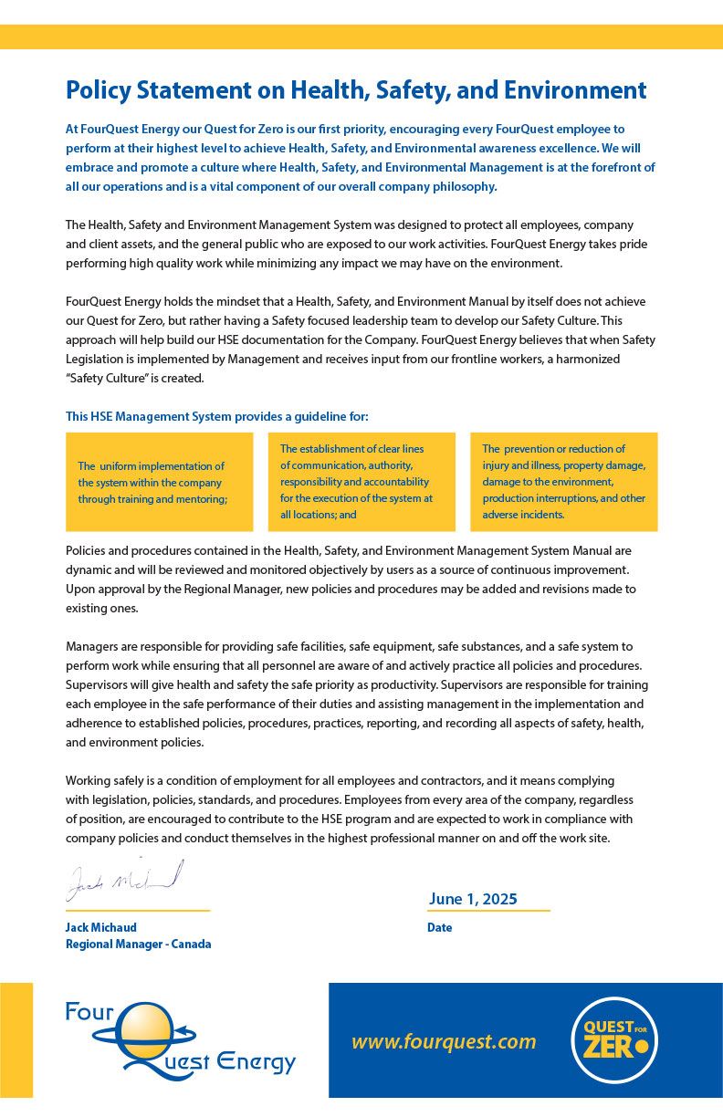 Working safely is a requirement of employment with FourQuest Energy, and that means complying with legislation, policies, standards, and procedures. Our employees must not only complete all mandatory safety courses, but are also encouraged to recommend and attend all applicable safety training courses available to our industry.